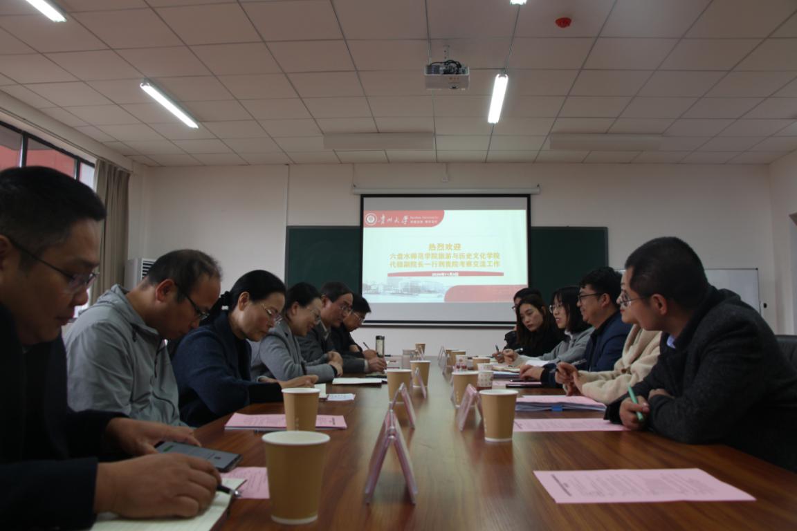 2020年11月2日,六盘水师范学院旅游与历史文化学院副院长代稳教授率队到我院考察交流,我院热情接待了代稳副院长一行并组织召开了考察交流会,会议在雅正楼309会议室举行,由党委副书记王丽主持。