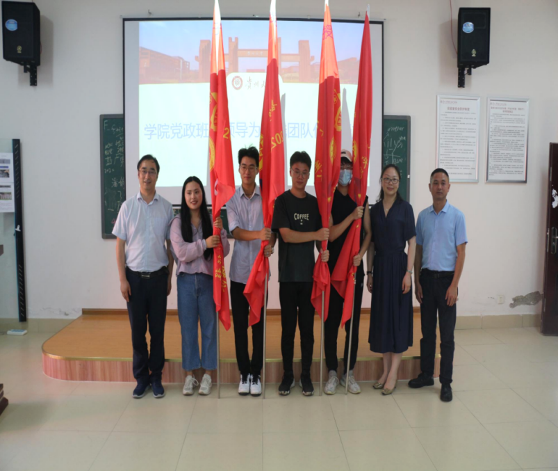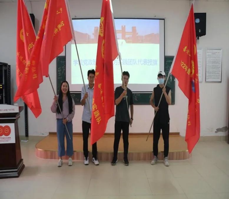 学院党政班子领导为“三下乡”实践团队代表授旗,鼓励同学们在基层实践活动中肩负使命,成长成才。同学们挥舞着手中的旗杆,鲜红的旗帜迎风飘动,预示着他们将以青春的姿态奔赴下一场山海,以朝气蓬勃的热情踏上新的征程。