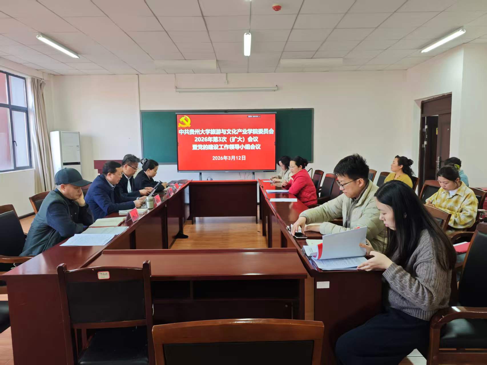 2026年3月12日下午,旅游与文化产业学院在雅正楼309会议室召开2026年第3次党委(扩大)会议暨党的建设工作领导小组会议,传达学习上级精神,全面部署学院树立和践行正确政绩观学习教育工作。学院党委书记冉光圭主持会议并讲话,学院党委、行政班子成员,党委委员,各党支部书记,机关科室负责人及教研室主任参加会议。